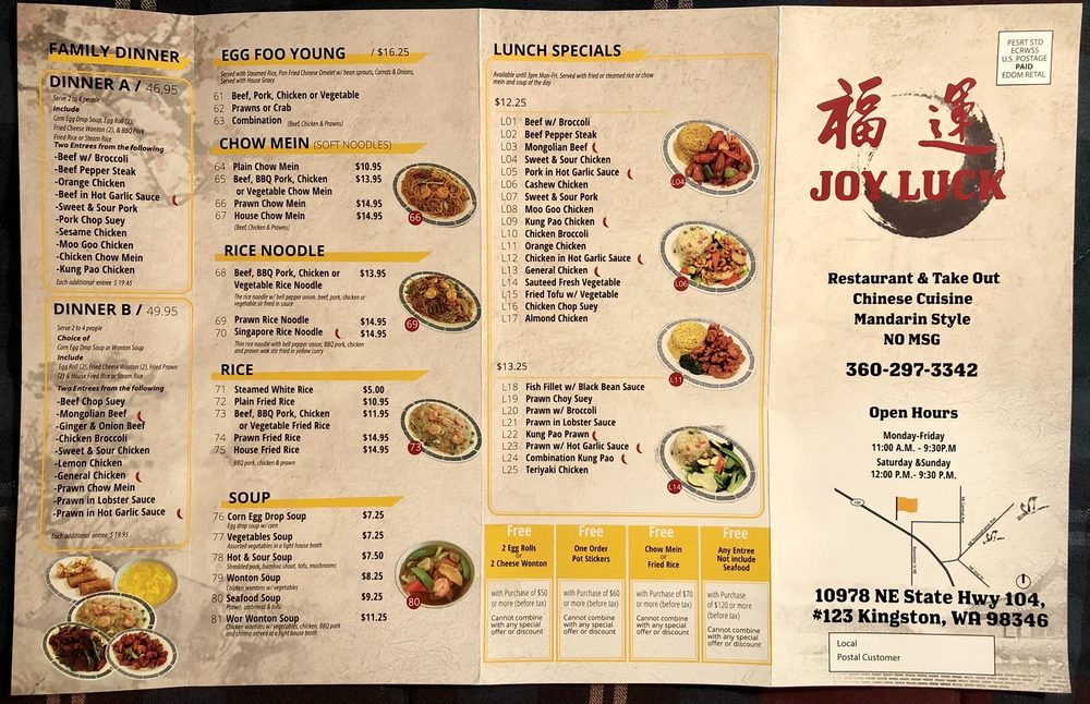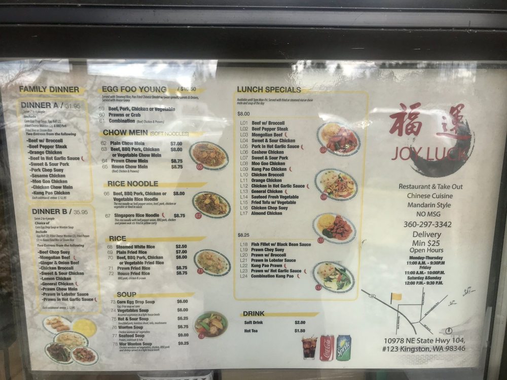 Introducing Joy Luck, a Chinese restaurant in Kingston, WA, known for its delicious dishes and excellent service. Customers rave about the House Fried Rice, Walnut Prawn, Mongolian Beef, Hot and Sour Soup, House Chow Mein, and Singapore Noodles. The menu offers a variety of options with no MSG, ideal for those seeking authentic Mandarin-style cuisine. The casual yet classy ambiance, along with amenities such as valet parking, free Wi-Fi, and outdoor seating, make it a great spot for lunch or dinner. Whether you're dining in, taking out, or getting delivery, Joy Luck impresses with flavorful dishes and generous portions. With positive reviews praising the quality of the food and the welcoming atmosphere, this restaurant is a must-visit for Chinese cuisine enthusiasts.